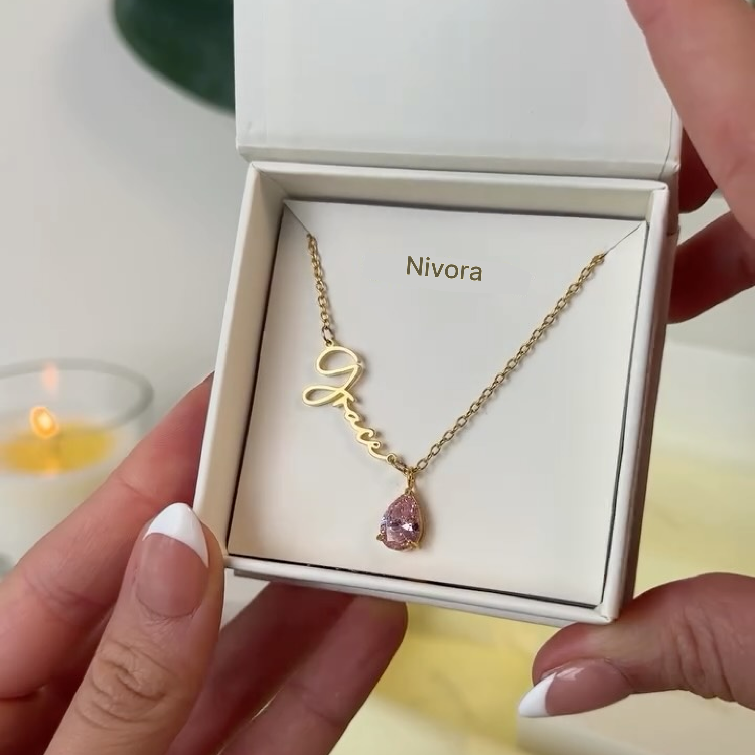 A name to hold close and a stone to remember. This custom necklace brings your story to life with your name in elegant script and a teardrop birthstone that carries personal meaning.